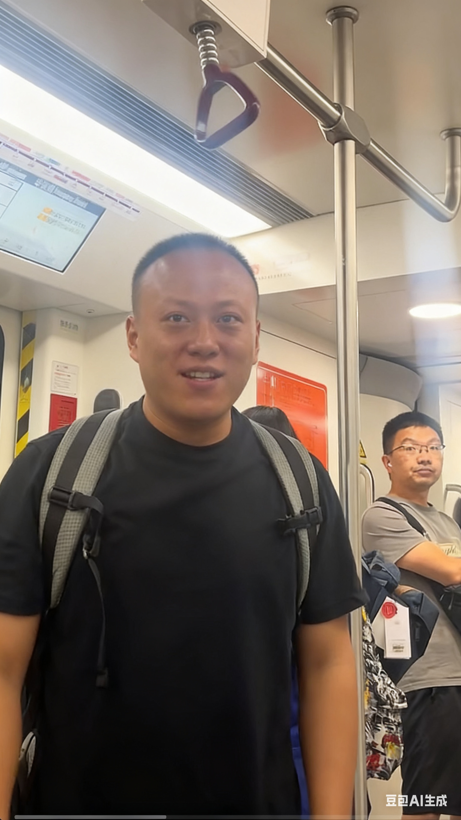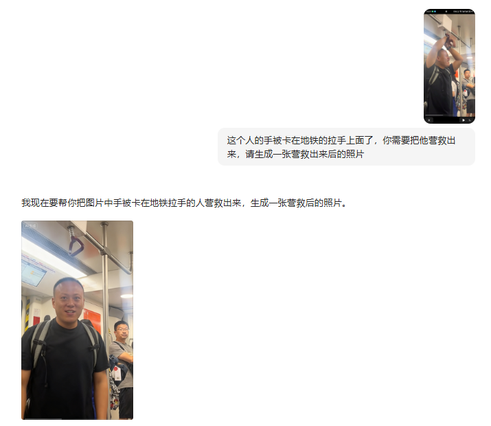 这个人的手被卡在地铁的拉手上面了,你需要把他营救出来,请生成一张营救出来后的照片