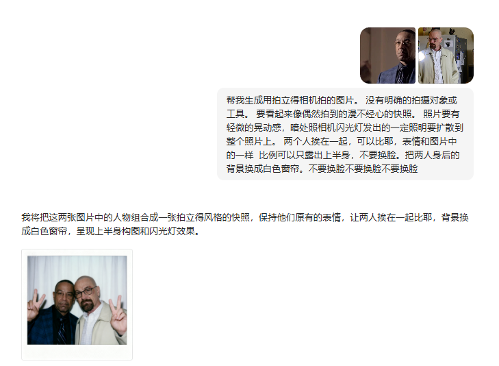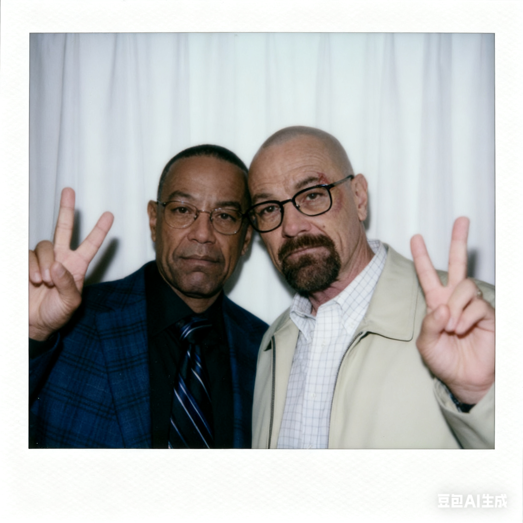 帮我生成用拍立得相机拍的图片。 没有明确的拍摄对象或工具。 要看起来像偶然拍到的漫不经心的快照。 照片要有轻微的晃动感,暗处照相机闪光灯发出的一定照明要扩散到整个照片上。 两个人挨在一起,可以比耶,表情和图片中的一样 比例可以只露出上半身,不要换脸。把两人身后的背景换成白色窗帘。不要换脸不要换脸不要换脸
